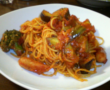 なのでトマト缶と冷蔵庫に余ってた茄子とブロッコリーとウィンナーでトマトのパスタを作る事にした。